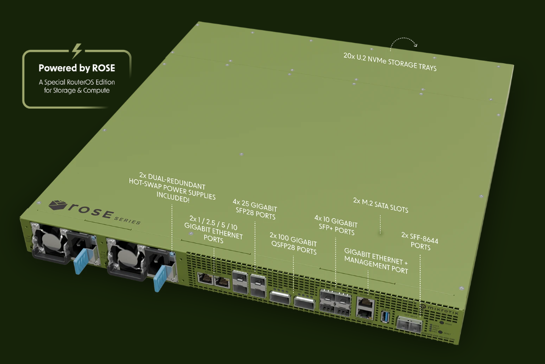 RDS is a high-performance, all-in-one storage, 100G networking, and container platform designed for enterprise environments. Featuring 20 U.2 NVMe storage slots and a special RouterOS Edition for Storage & Compute (ROSE).