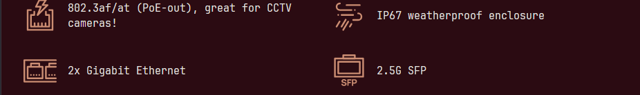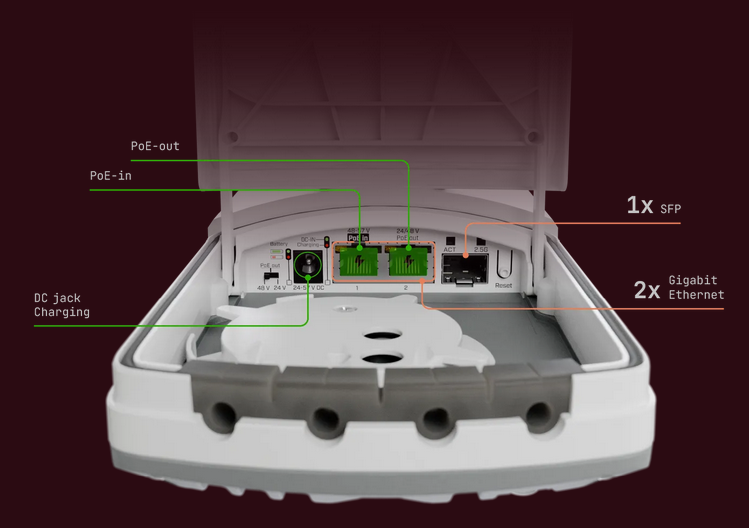 A weatherproof Fiber-to-Copper converter with 2.5G SFP and 2x Gigabit Ethernet ports, including PoE-out on Ether2. Its integrated battery keeps links stable during short power interruptions, preventing unnecessary renegotiations and device reboots.